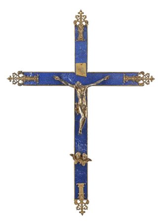 Cristo crocefisso in vermeil con puntali traforati e teste di cherubini nella base, croce in lapislazzuli rivestita al retro in argento inciso a volute e palmette nella bordura. Iscritto nel cartiglio al retro "PIE IX VATICAN 28 FEB 1875", anno del Giubileo. Reca punzoni stato camerali di Loreto e Vincenzo Belli II, Roma (cm 62x44) Montato su base in plexiglass (difetti)