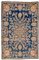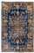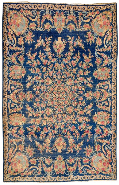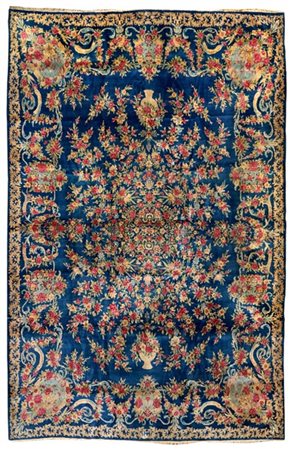 Tappeto Kirman, Persia, prima metà secolo XX. Decoro all over formato da rami di rose fiorite, alcune delle quali fuoriescono da due vasi alle estremità. Campo colore blu con angolari azzurri delimitati da nastri e rami fioriti, una bordura a meandro con volute in beige e nocciola sul medesimo campo blu (cm 390x290) (difetti)