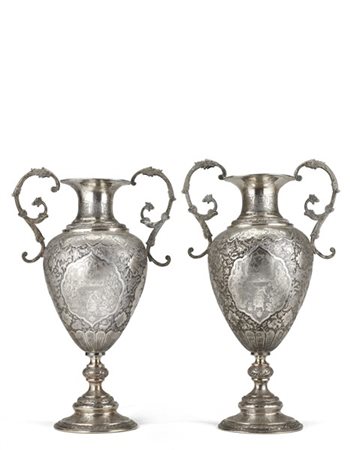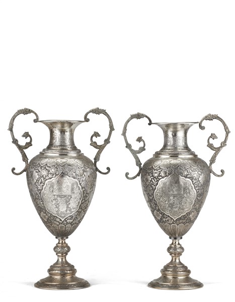 Manifattura persiana, secolo XIX. Coppia di vasi biansati in argento, corpo ovoidale su base circolare con decorazione incisa a figure e rami fioriti entro riserve mistilinee su fondo a volute fiorite e volatili (g 4450) (h. cm 50) (difetti)