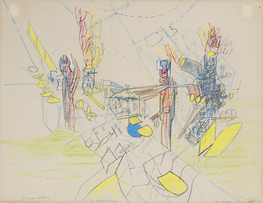 Roberto Matta , Santiago del Cile 1911 , Civitavecchia 2002 "Les sentiers de la terra"  (1961) tecnica mista su carta, cm 49,5x64,5 Titolato in basso al centro e datato 14 juillet 6 in basso a destra L'opera è accompagnata da certificato di autenticità su fotografia rilasciato da Ramunteho Matta recante il n.di archivio DRA061F846