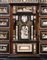 Grande monetiere di struttura architettonica a due corpi impiallacciato in palissandro e legni vari con profili ebanizzati e intarsiato in avorio e osso con scene storiche, candelabra e stemma araldico dei Re Cattolici Ferdinando V d'Aragona (1452-1516) e Isabella di Castiglia (1451-1504) su fondo in tartaruga. Parte superiore a dodici diverse cassetti pannellati, anta centrale con doppia colonna che rivela vano a giorno ad arco e fondo specchiato ed un tiretto, ringhiera traforata in metallo e cimasa centrata da monogramma F.Y. coronato entro riserva a cartiglio. Parte inferiore con fascia a tre finti cassetti, sei gambe a obelisco rovesciato con raccordi di stesso decoro. Spagna, secolo XIX (cm 175x238x58) (difetti e restauri)