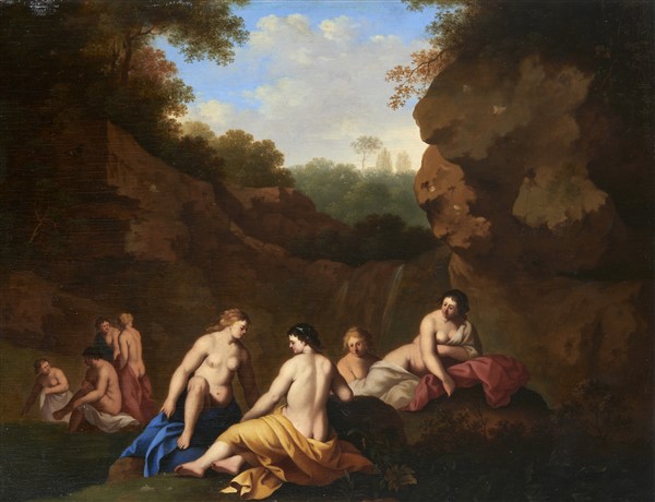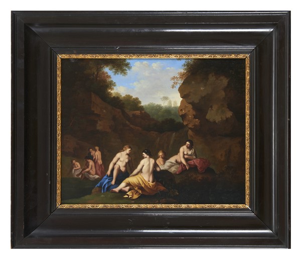 Jan van Haensbergen (attr.) "Bagnanti" olio su tavola (cm 33x26,5) etichetta al