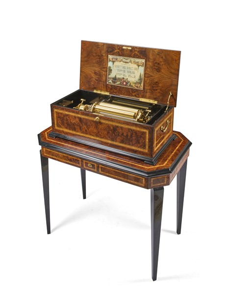 Poggiante su tavolo con piano ottagonale e gambe sfaccettate (cm 93x76,5x57) (difetti, la macchina musicale necessita di una revisione)