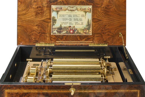 Scatola musicale del tipo Cartel Revolver a sei cilindri con doppia serie di risuonatori per un totale di centoquarantaquattro denti e ventiquattro arie.