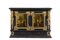 Cabinet in ebonized wood with two doors above two drawers with painted panels depicting knights in a landscape, borders and friezes in relief carved wood and gilded scrolls and cherubs. 17th century (cm 104x71x43) (defects and restorations)