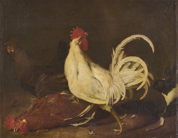 Giovanni Agostino Cassana "Battaglia di galli" olio su tela (cm 80,5x98) in corn