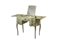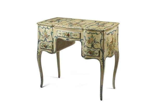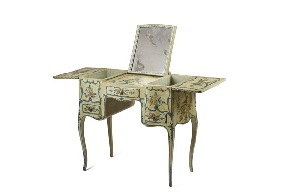 Mobile toilette in legno dipinto, laccato e decorato in policromia a fiori e volute fogliate nei toni del blu, piano sagomato a tre scomparti decorati all'interno e specchio centrale, fronte a tre tiretti, gambe mosse. Genova, secolo XVIII (cm 88x78x47) (restauri)