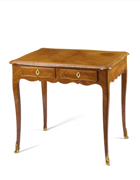 Tavolino da centro con piano di forma sagomata, lastronato e decorato a motivi geometrici, fasce mosse a due cassetti e due finti cassetti, gambe sagomate, scarpette in bronzo dorato e cesellato. Francia, secolo XVIII (cm 80x71x64) (difetti)