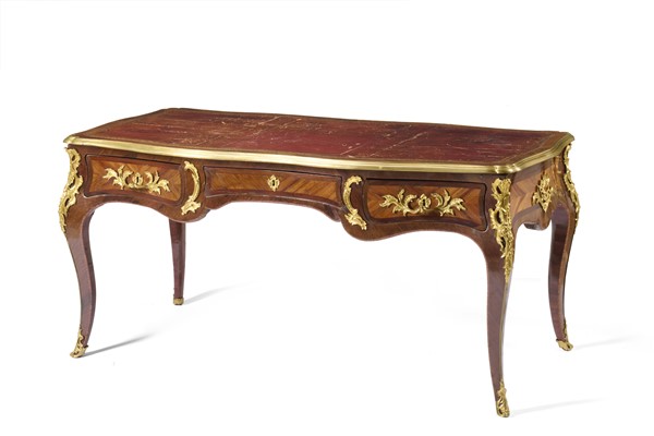 Scrivania diplomatica lastronata in legni vari, piano di forma sagomata rivestito in pelle e decorato con profilo in bronzo, fascia a tre cassetti in linea, gambe mosse decorate da applicazioni e scarpette in bronzo dorato e traforato. Francia, fine secolo XVIII (cm 156x73x54) (difetti)