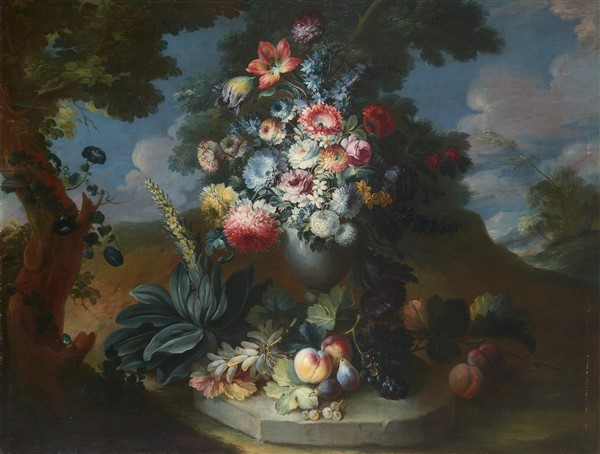 Michele Antonio Rapous "Composizione con vaso di fiori all'aperto" olio su tela