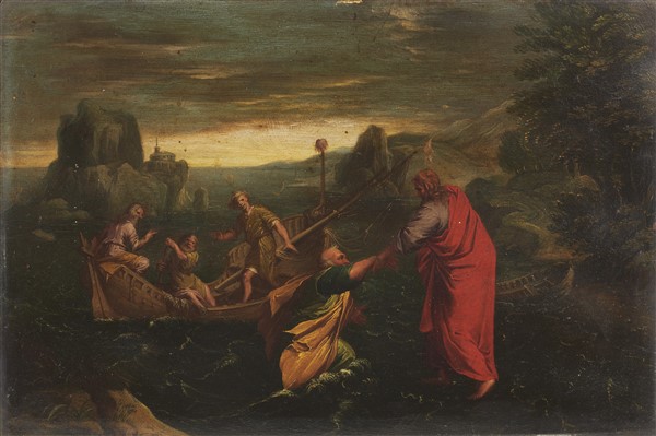 Maestro del secolo XVII "La chiamata di san Pietro" olio su rame (cm 15x25) in