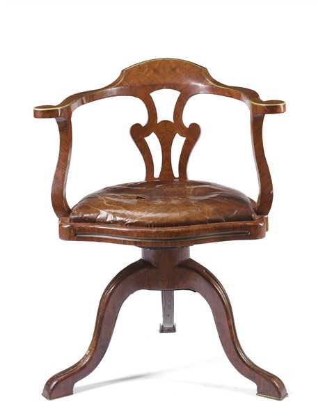 Poltrona girevole di forma mossa lastronata in bois de violette, profilata in bronzo dorato, schienale traforato, braccioli a ricciolo, seduta rivestita in cuoio. Sicilia, secolo XVIII (difetti)
