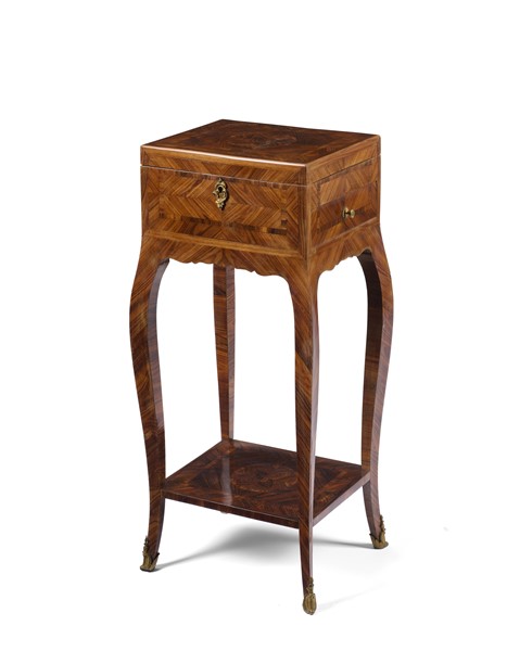 Tavolino da lavoro lastronato e filettato in palissandro. Piano apribile celant