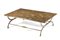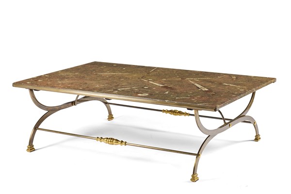 Tavolo da salotto di forma rettangolare con piano marmo fossile brown, gambe in metallo brunito e dorato (cm 140x41x92) (difetti)