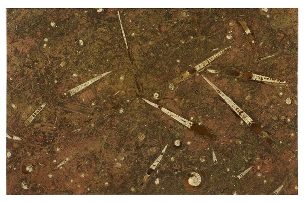 Tavolo da salotto di forma rettangolare con piano marmo fossile brown, gambe in