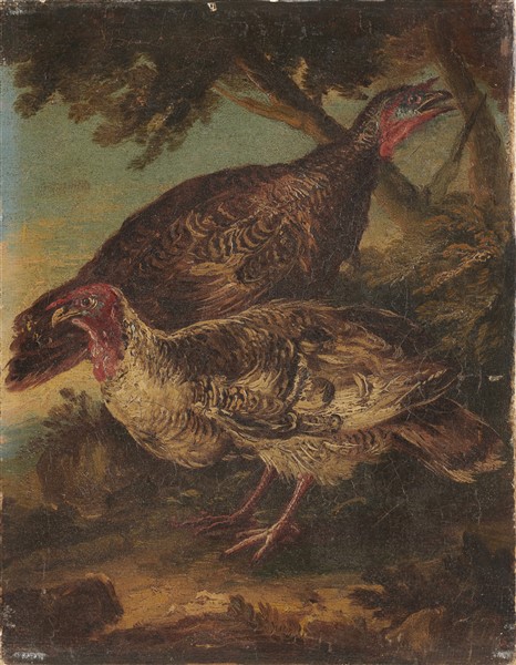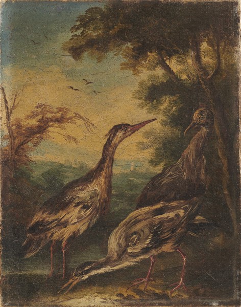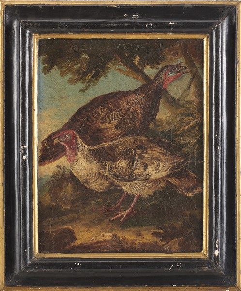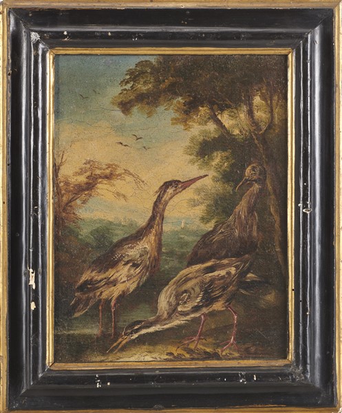 Giovanni Crivelli "Volatili in un paesaggio"coppia di dipinti ad olio su tela (