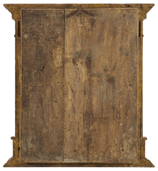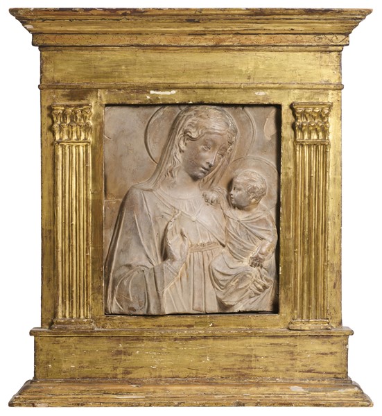 Alceo Dossena (Cremona 1878 - Rome 1937) 'Madonna and Child' high relief in terracotta (39x32 cm), inside ancient architectural tabernacle in carved and gilded wood (72x66.5 cm) (defects)
