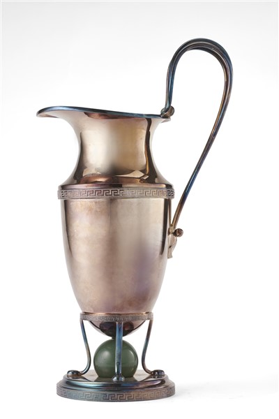 Versatoio in argento con profili a greca, ansa sagomata, base circolare centrata da sfera in pietra dura. Milano. Argentiere De Vecchi (g lordi 950) (h. cm 32) (difetti)