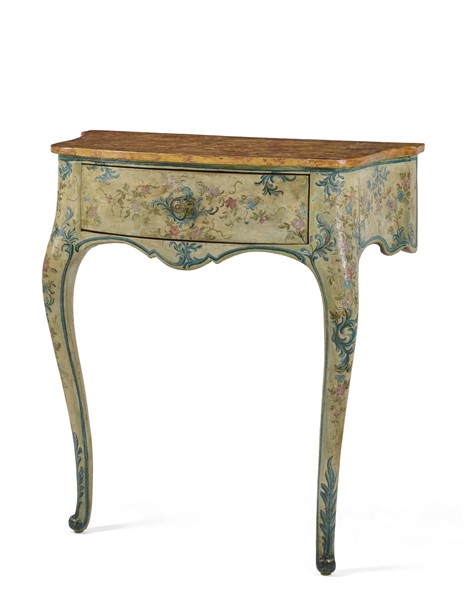 Mobile hanging console in wood painted with a light green background with a vegetable motif reserve decoration and bouquets of flowers in polychrome. Drawer in the band, legs moved, top painted in faux marble. Genoa, 18th century (cm 78x83x40) (defects and shortcomings)