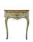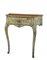 Console a mensola di forma mossa in legno dipinto a fondo verde chiaro con decoro a riserve a motivo vegetale e a mazzi di fiori in policromia. Cassetto nella fascia, gambe mosse, piano dipinto a finto marmo. Genova, secolo XVIII (cm 78x83x40) (difetti e mancanze)