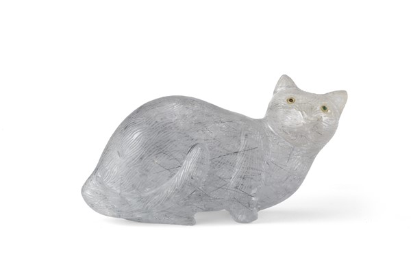 Arte del secolo XIX. Scultura raffigurante gatto in quarzo tormalinato, occhio in smeraldo (cm 13x7) (difetti e mancanza)