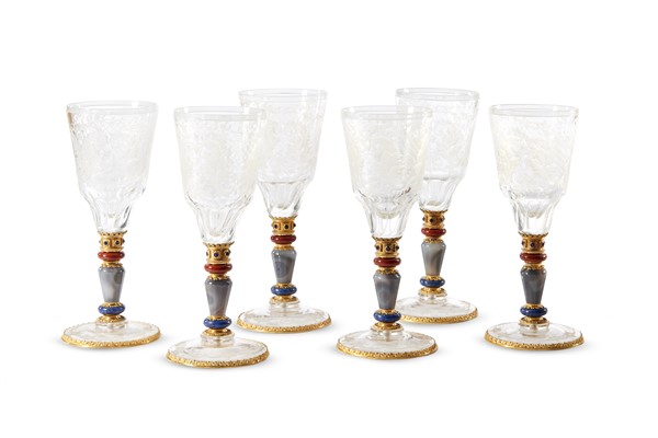 Gruppo di sei calici con coppe in cristallo inciso a motivi vegetali, basi in argento dorato con parti in agata, pietre dure e cristallo. In custodia (lievi difetti)