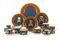 GUCCI. Parte di servizio da tè e caffè in porcellana policroma della serie "Le poltrone" composto da: otto tazzine da tè con piattini, otto tazzine da caffè e sette piattini, lattiera, zuccheriera, una tazza grande, otto piatti piani da dolce ed un vassoio circolare (difetti)