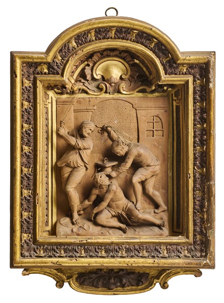 Scultore lombardo del secolo XVIII. "Flagellazione di Cristo", rilievo in cirmo