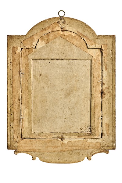 Lombard sculptor of the 18th century. "Flagellation of Christ", relief in carved pine (20x16 cm) in an architectural frame in carved and gilded wood decorated with volutes, within a shaped shrine (40x28 cm) (defects)