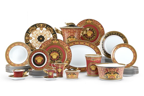 Manifattura di Rosenthal su disegno di Versace, secolo XX. Parte di servizio di patti della serie "Medusa" composto da: otto sottopiatti, otto piatti piani, otto piatti fondi, otto piatti da frutta, otto piatti da dolce, vassoio ovale, due vassoi circolari, insalatiera, zuppiera con coperchio, vaso portafiori e parte di servizio da tè e caffè composto da: otto tazze da tè con piattini, otto tazze da caffè con piattini, lattiera e una zuccheriera con coperchio (difetti)