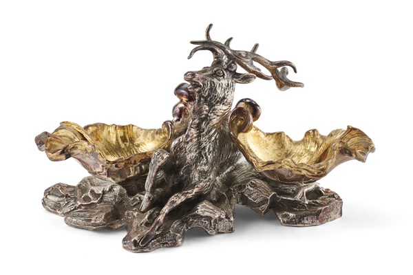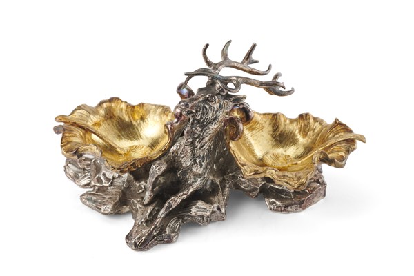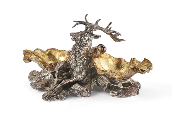 Saliera a forma di cervo in argento e argento dorato con due cucchiai (g 850) (cm 16x10) (difetti)