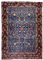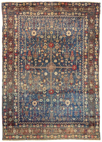Tappeto Qashqai, Persia, inizio secolo XX. Decoro con albero della Vita, volatili, vasi fioriti su fondo blu, bordura principale con motivo Herati su fondo bordeaux (cm 225x161) (lievi difetti)