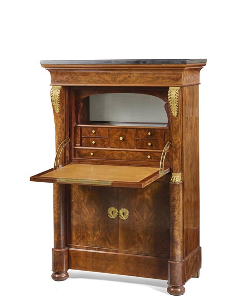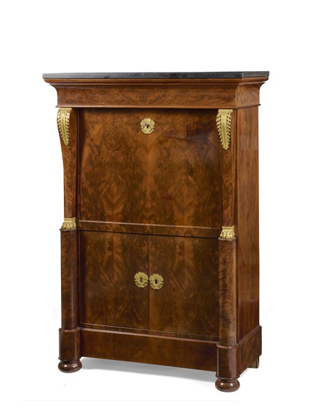 Secretaire lastronato in piuma di mogano con un cassetto sottopiano, calatoia che rivela vano a giorno specchiato, sei tiretti e due segreti laterali. Parte inferiore con due ante che rivelano tre cassetti. Lesene superiori sagomate terminanti a zampa ferina poggianti su colonne a tutto tondo. Guarnizioni in bronzo. Piano in marmo nero. Secolo XIX (cm 100x145x41) (difetti)