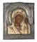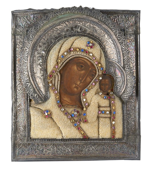 Arte russa, secolo XIX. Icona a tempera su tavola raffigurante Madonna di Kazan con riza in argento decorata a volute e foglie.Vesti in microperle e vetri policromi. Mosca, 1860-1884. Argentiere Andrei Beckman. Scritte incise al retro (cm 30x26) (difetti)
