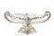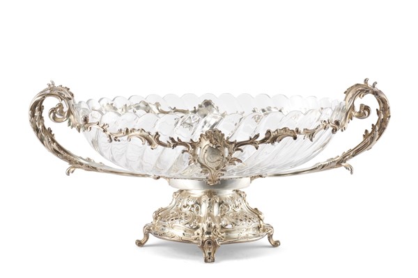 Centrotavola biansato in argento interamente decorato a volute fogliate e cartigli cifrati con vasca in cristallo, base traforata a finte ringhiere, piedi a ricciolo. Francia, fine secolo XIX. Punzoni alla base di difficile lettura (g 1200) (cm 45x20) (difetti)