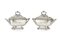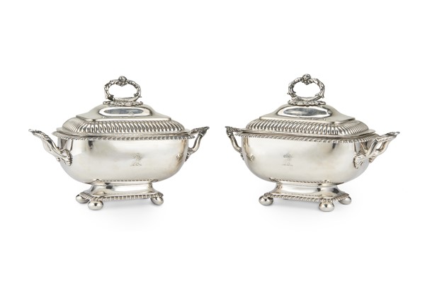 Coppia di piccole legumiere biansate con coperchio e vaschetta amovibile interna in argento inciso con cresta a testa di cavallo, bordi cordonati su piedini a cipolla, coperchio baccellato, presa ad anello in forma di serpenti. Londra, 1807. Argentiere John Emes (cm 23x17) (g 1690) (lievi difetti)