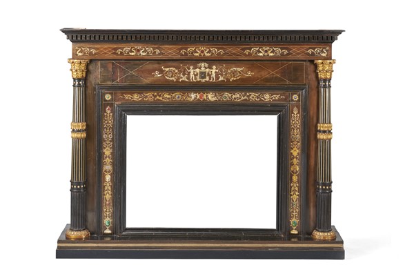 Camino in legno con intarsi in avorio e pietre dure, profili ebanizzati, montanti a colonna scanalata filettati in avorio (cm 156x121) (difetti)