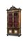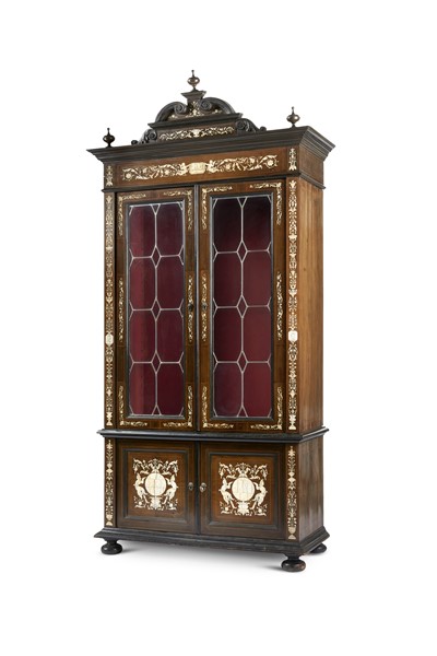 Vetrina impiallacciata e filettata in legni vari con profili ebanizzati, interamente decorata da intarsi in avorio con decoro a volute fogliate e medaglioni con paesaggi e candelabra. Parte superiore a due ante con vetri piombati e cimasa intagliata a volute contrapposte con pinnacoli. Parte inferiore a due ante pannellate, piedi a cipolla. Lombardia, secolo XIX (cm 124x256x49) (difetti)