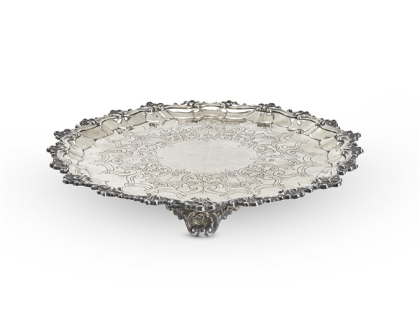 Salver in argento con bordo mosso decorato a valve di conchiglie e cavetto inciso a volute fogliate, piedi a conchiglia. Londra, 1878 (d. cm 36) (g 1300)