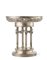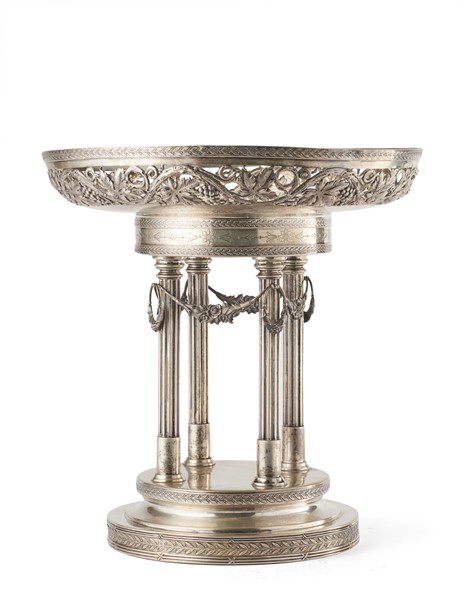 Silver centerpiece with perforated edge and chiseled screw and grapes. Basket supported by four fluted columns joined by festoons on a circular base. Silversmith Gavril Grachev. Saint Petersburg, beginning of the 20th century (g 1650) (h. cm 32, d. cm 30) (missing the glass tank)