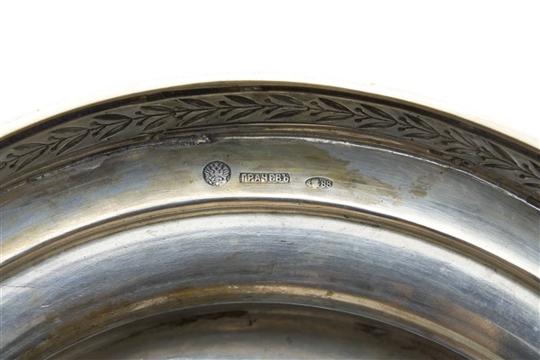 Centrotavola in argento con bordo traforato e cesellato a vite e uva. Cestino sorretto da quattro colonne scanalate riunite da festoni su base circolare. Argentiere Gavril Grachev. San Pietroburgo, inizio secolo XX (g 1650) (h. cm 32, d. cm 30) (mancante della vasca in vetro)
