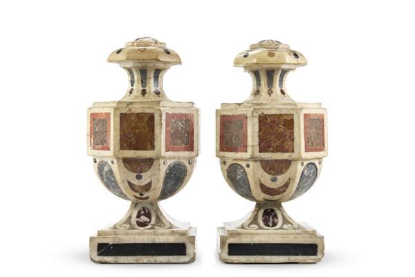 Coppia di obelischi in forma vasi in marmo bianco con intarsi in marmi policromi, corpo sfaccettato su base quadrata. Napoli, secolo XVII (h. cm 33) (restauri, mancanze e sbeccature)