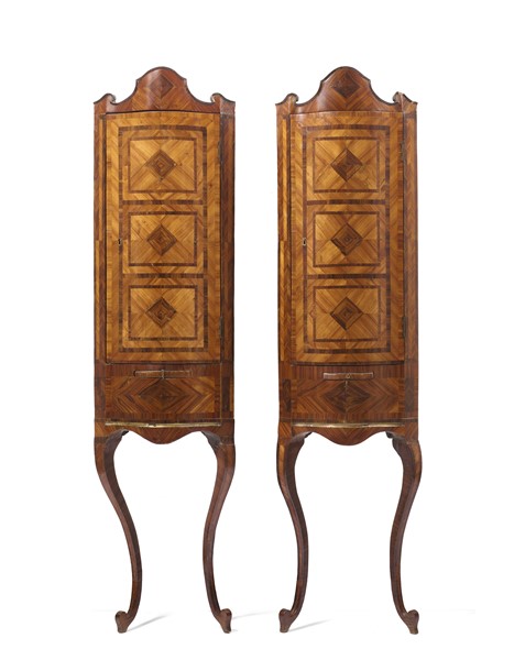 Coppia di angoliere ad un'anta lastronate in bois de rose e palissandro, filettate in bois de violette, cimasa di linea spezzata e gambe mosse. Pianetto estraibile. Sicilia, secolo XVIII (cm 35x164x29) (difetti e lievi restauri)