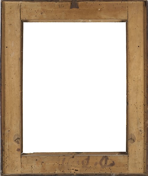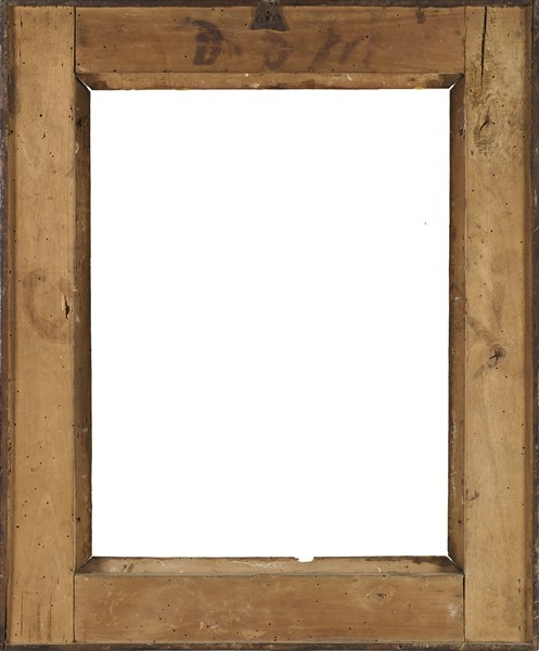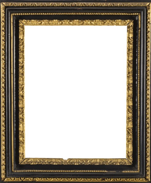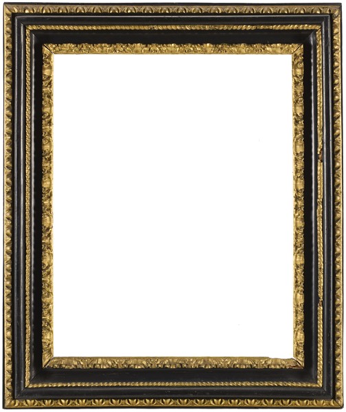 Coppia di antiche cornici rettangolari in legno intagliato, ebanizzato e dorato con profili a rilievo, fascia interna cordonata (cm 53x62; luce cm 34x46,5) (difetti)