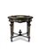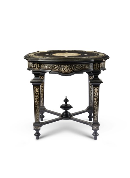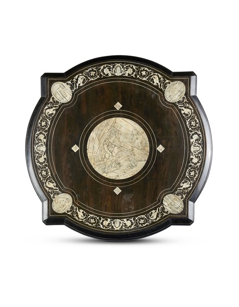 Tavolo da centro di forma sagomata in legno ebanizzato riccamente intarsiato e filettato in avorio con decoro a volute fogliate e medaglioni con figure classiche e amorini e candelabra, gambe a obelisco rovesciato raccordate da crociera centrata da pinnacolo. Lombardia, secolo XIX (d. cm 86, h. cm 81) (difetti e restauri)