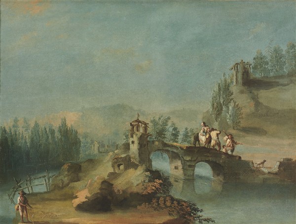 "Veduta con ponte e viandanti"