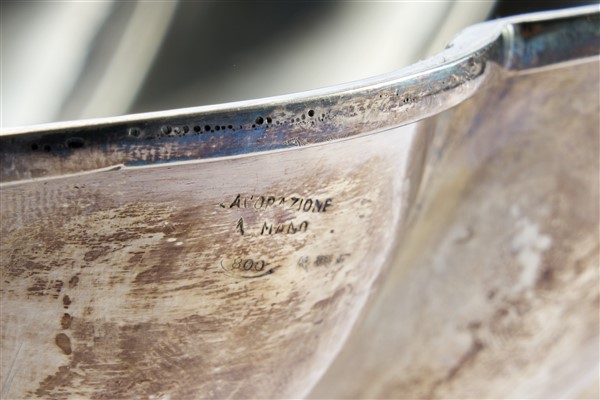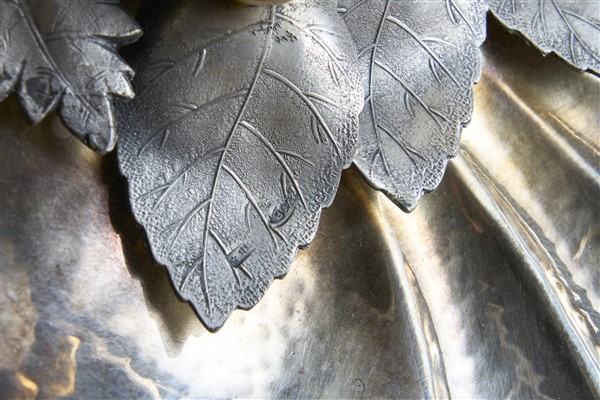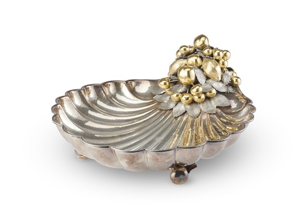 Centrotavola in argento in forma di valva di conchiglia con decoro di frutti e