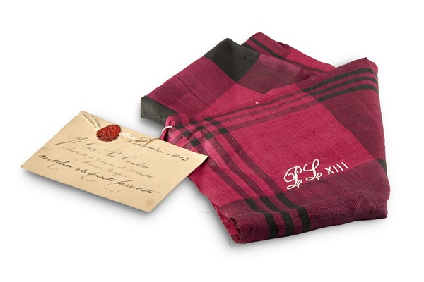 A red silk handkerchief monogrammed in white 'P L XIII', belonging to Pope Leo XIII (1810-1903), attached with a cotton thread sealed with sealing wax to the calling card of Cavalier Pio Centra, chamberlain to His Holiness and Pontifical Mace-bearer, and handwritten by him «Settembre 1903 / Il [...] certifica che questo fazzoletto (al verso) fù usato da Sua Santi- /tà Leone XIII / S. M.»( 'September 1903 / I [...] certify that this handkerchief (on the reverse) was used by His Holiness Leo XIII / S. M.'"