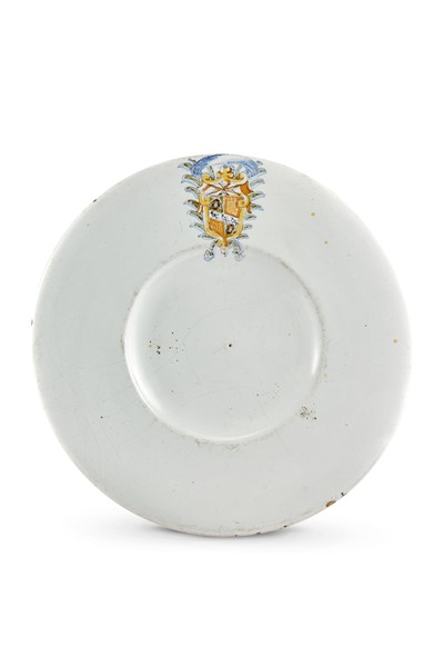 Manifattura del secolo XVII. Piatto in maiolica bianca decorato in policromia con stemma araldico (d. cm 36) (difetti)