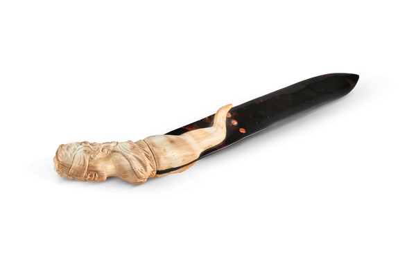 Arte di fine secolo XIX. Tagliacarte in tartaruga con presa in conchiglia scolp